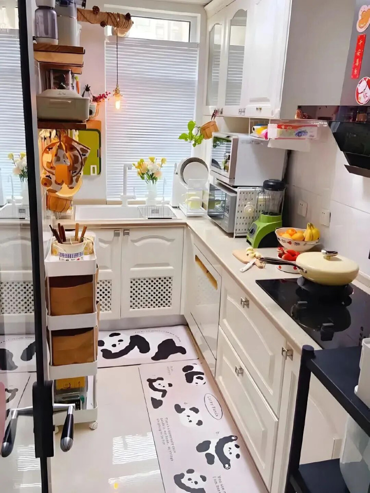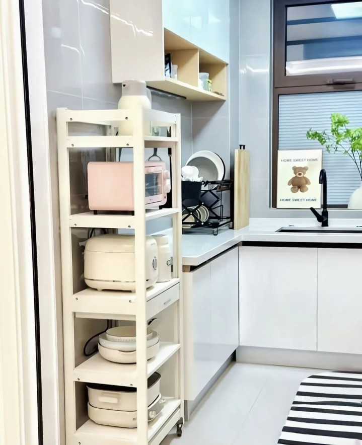 如若也曾装修好,那就来个收纳架吧,雷同不错把那些厨房电器们都“安置”起来,整洁又不占空间。