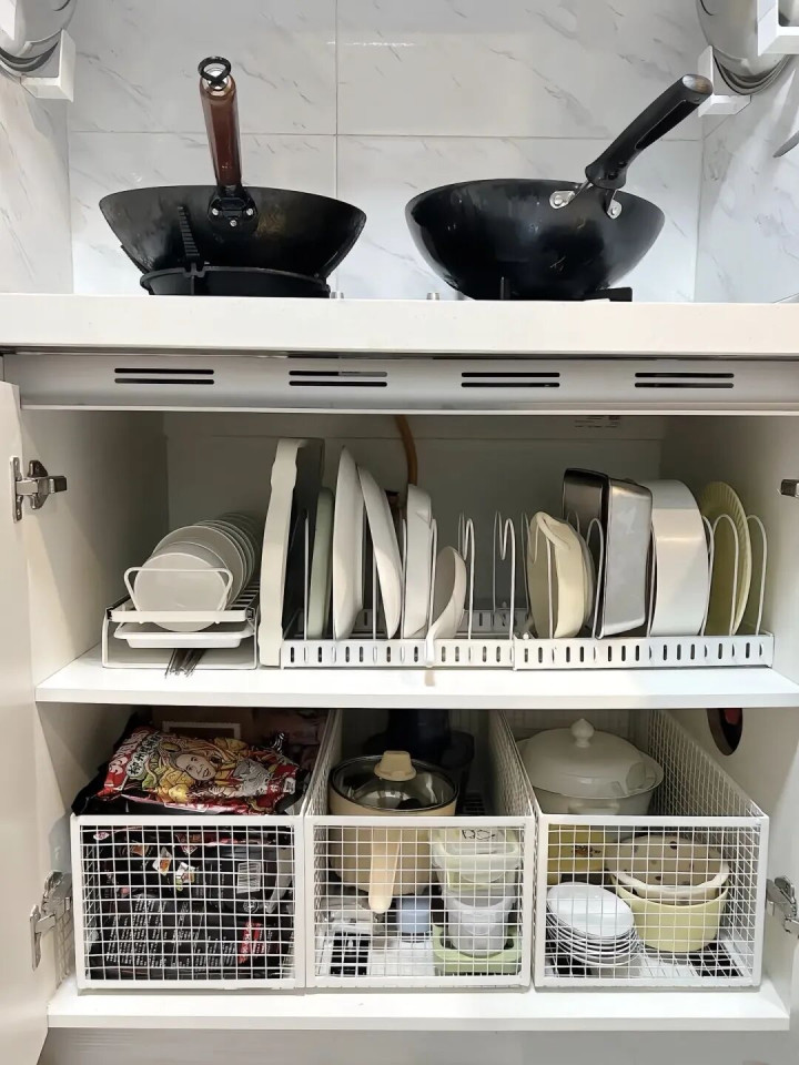 如若咱们也曾深陷平开门柜子的“迷宫”,咱们不错在柜子里增多一些滑轮收纳盒、抽拉滑轨之类的神器,这些演义念具能让咱们橱柜的收纳空间须臾“升级打怪”,还能挽回咱们的腰背健康。