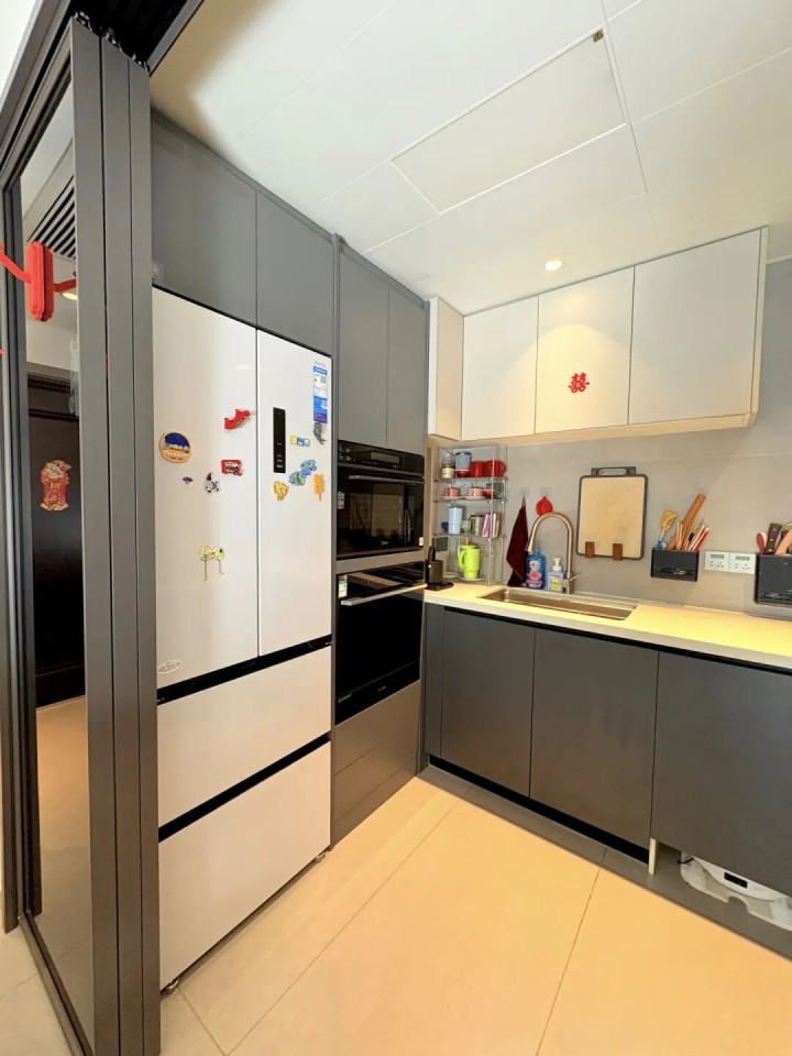 洗碗机、烤箱那些不合适“站”的,平直装进柜子里。既好意思不雅又好收拾,既不占地又能领有超高颜值。